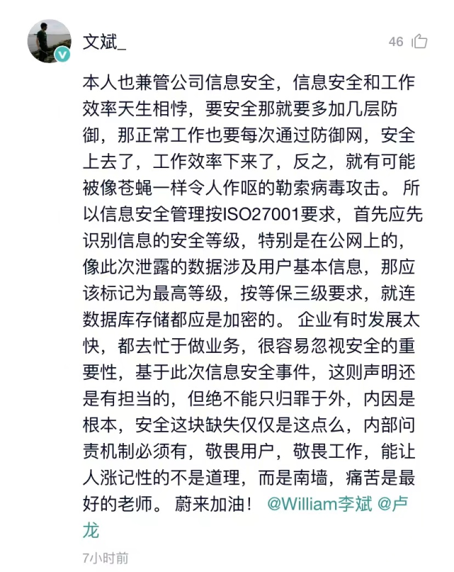 该网友还指出,信息安全管理应按照ISO27001要求,首先识别信息的安全等级,像此次泄露的涉及用户基本信息的数据应标识为最高等级,按等保三级要求,就连数据库存储都应加密。同时,蔚来此次发生的信息安全事件,不能只归罪于外,内因是根本,必须有相应的内部问责机制。