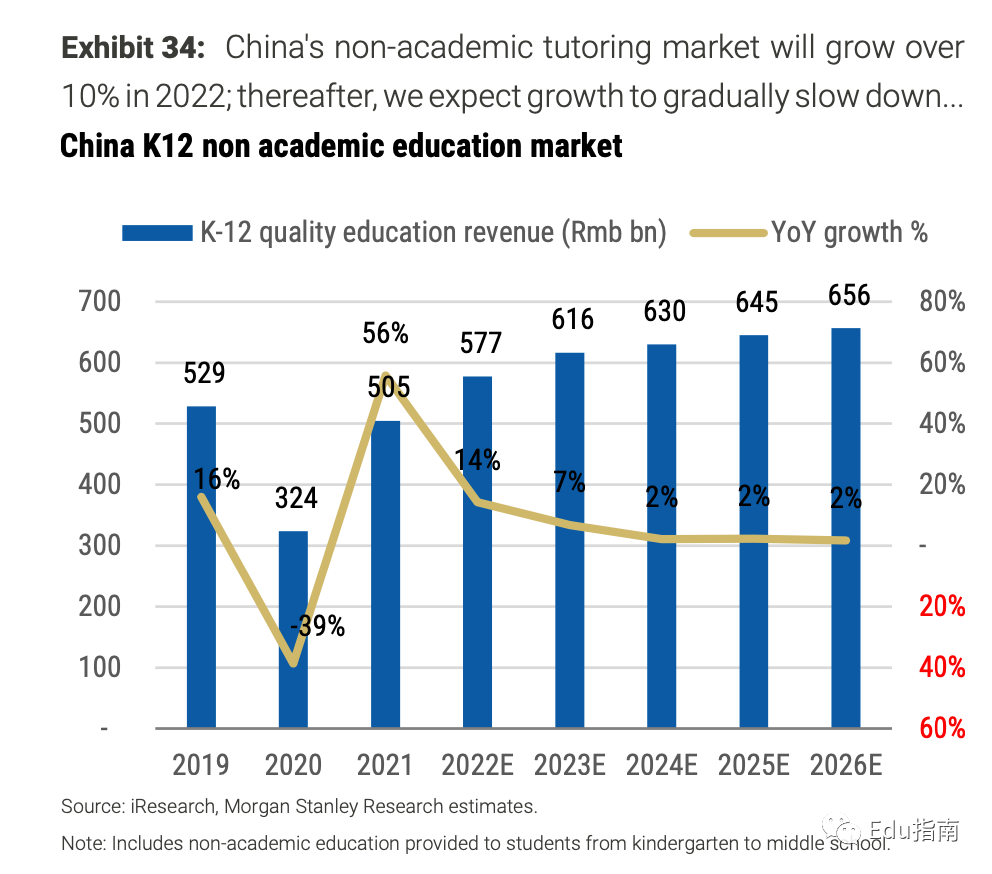 该方向的确认和转型,得益于现时代家长们对孩子综合素质提升的需求,对应市场规模逐渐增长。根据投行摩根士丹利今年9月报告数据,随着人们对素质教育为主的非学科辅导需求增加,非学科辅导市场规模2022年增速达14%,达到5770亿元人民币,而2021年该市场为5050亿元人民币,本年度市场规模增长720亿元。
