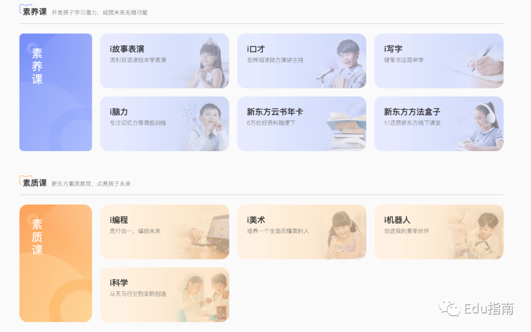 根据最新官方信息,当前新东方公司的素质教育业务,提供素养课,素质课两大类。其中素养课包括故事表演、口才、写字、脑力等学习课程。而素质课程包括编程、美术、机器人、科学等课程。