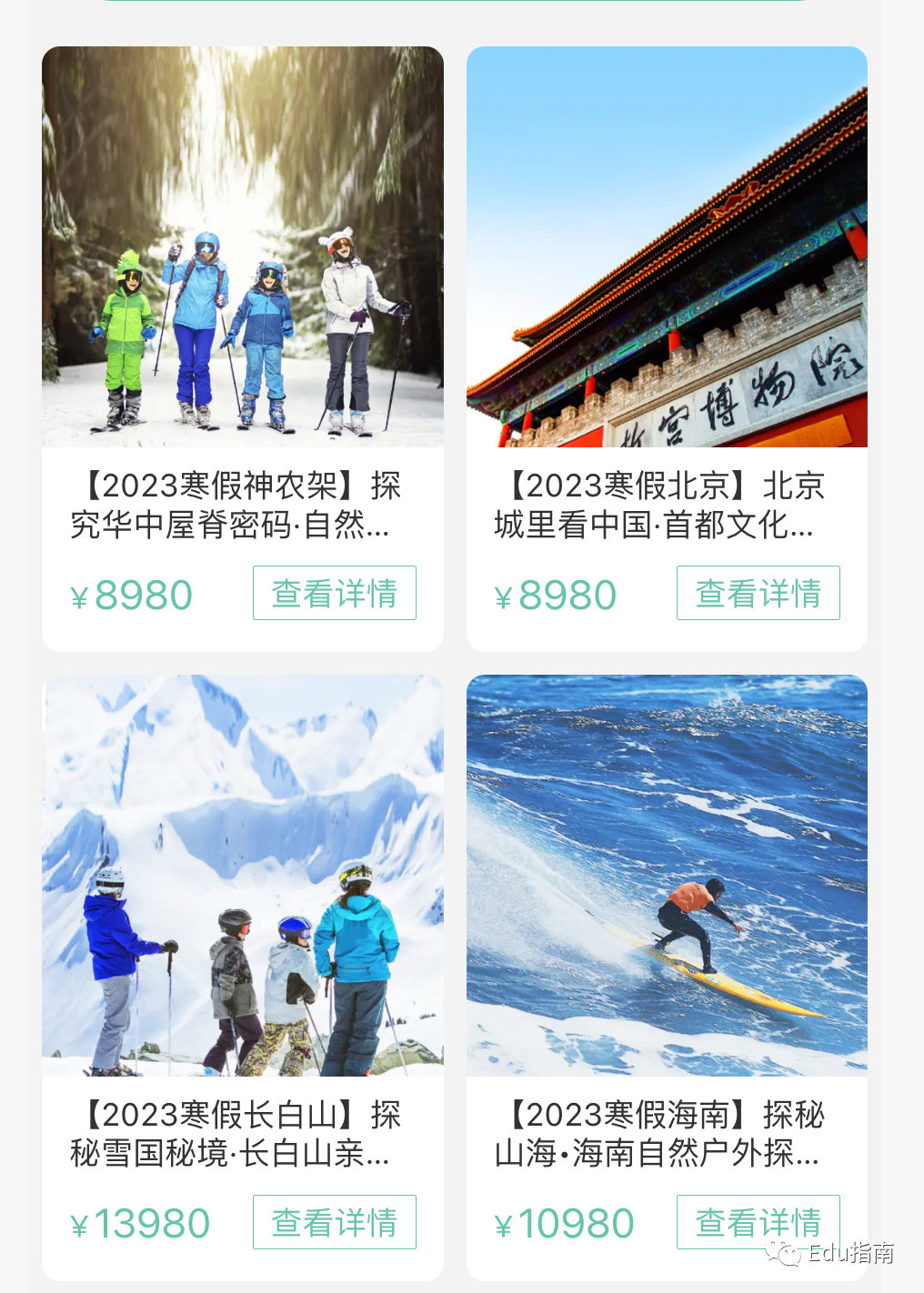 该方向课程定价主要在数千元至万元级别不等,面向用户主要是青少年儿童。具体的营地教育拓展项目,例如2023年寒假“探究华中屋脊密码”、“北京城里看中国”、“探秘雪国秘境”等等,定价在8980元~13980元不等,相较而言定价远高于素质素养线上课程。