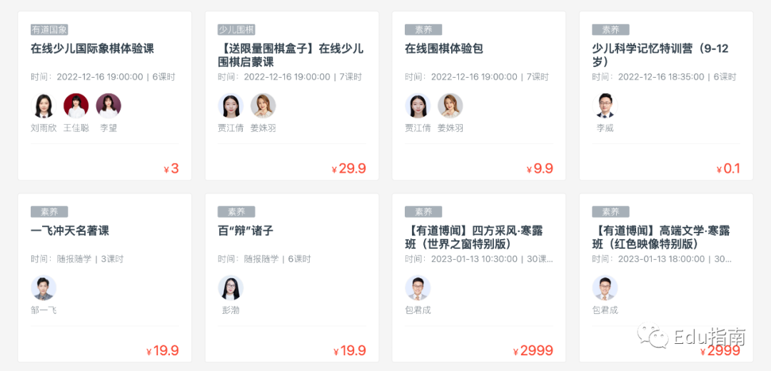 根据官网最新信息,有道精品课支持围棋、国际象棋、脑力、编程、科学、音乐等学习服务。产品类型包括至十元以下的体验课,以及千元级别的正价课。