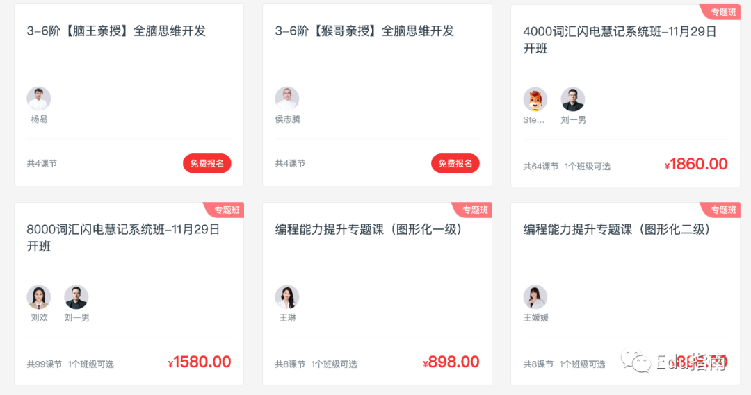 其课程产品主要分为免费的体验课、数百元至千元级别的正价课。例如全脑思维开发学习提供4节免费课程学习。而“4000词汇闪电慧记系统班”定价为1860元。