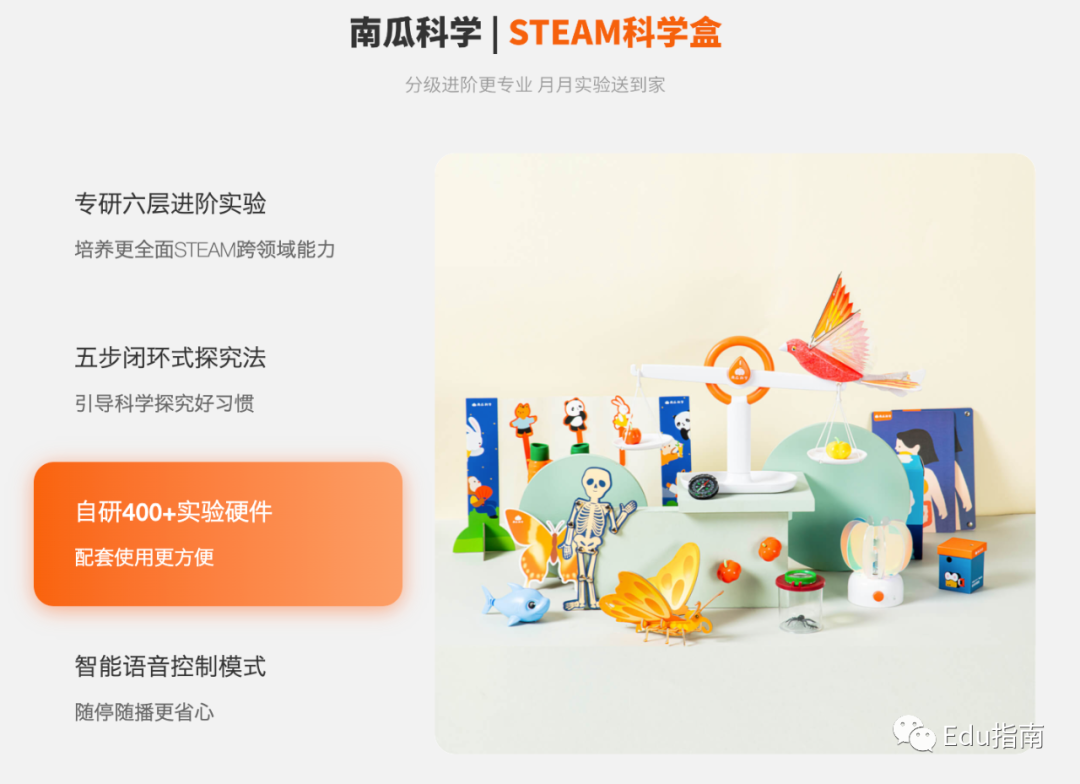 南瓜科学于去年推出,至今该品牌产品包括STEAM科学盒、科学益智玩具。根据官方最新信息,STEAM科学盒子,用于帮助用户培养STEAM跨学科能力,通过实验硬件等配套,进行探究学习。而科学益智玩具,基于多元主题,为用户提供趣味科普体验。