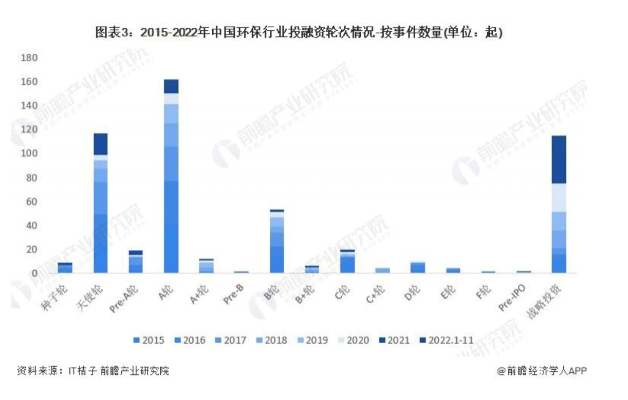就单笔融资而言,2021 为7亿元左右,2022 年前11月环保行业单笔融资金额未超过5亿人民币。从投资轮次看,主要聚集于B轮以前,C 轮后的融资寥寥无几。整体来看,我国环保行业投融资仍处于早期阶段。