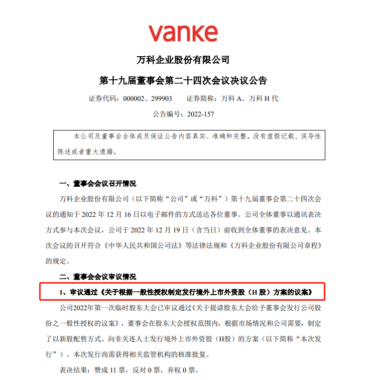 12月20日,万科A公告称,公司董事会制定了拟以新股配售方式、向非关连人士发行境外上市外资股(H股)的方案。