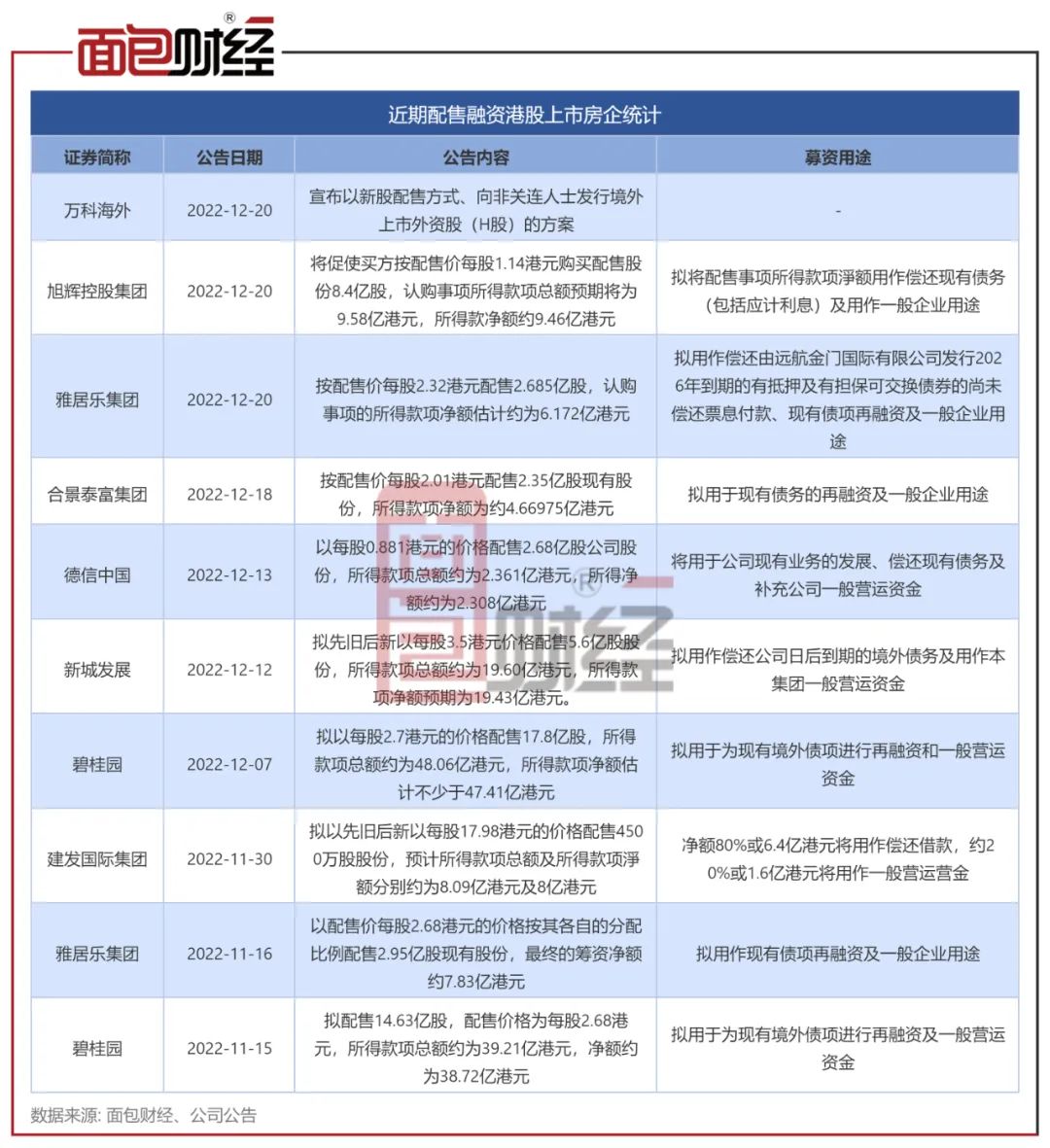 值得关注的是,在支持房企融资的多重政策利好下,包括旭辉控股集团、新城发展在内,近期多家港股房企已陆续宣布配售融资。其中,碧桂园、雅居乐更是抛出二轮配售融资计划。从募集资金用途来看,大多房企指向了补充流动资金及偿还债务。