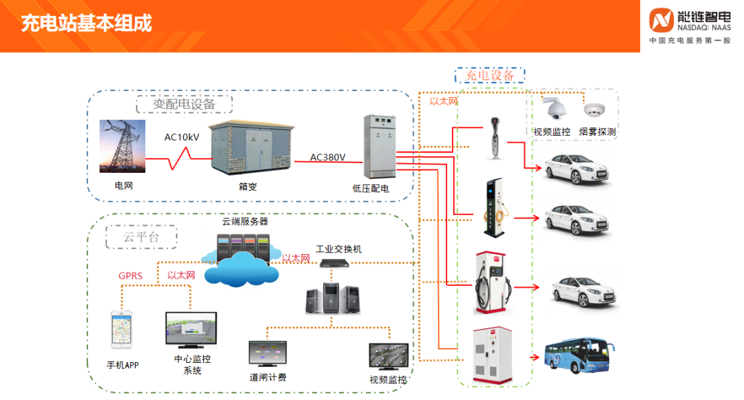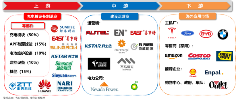 充电桩产业链可以分为上游:零部件和充电设备,中游:建设运营商,下游:应用市场。