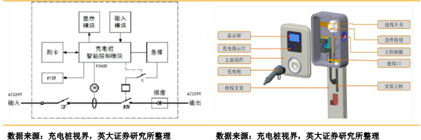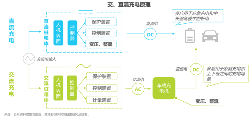 因此,衍生出两种主要的技术路径:一是交流充电桩、二是直流充电桩。 (1)交流充电桩