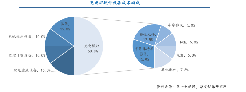 充电模块占比最高达50%。其中,细分成本来看,功率器件(30%)、磁性元件(25%)、半导体IC(10%)、电容(10%)、PCB(10%),其他如机箱风扇等占15%。