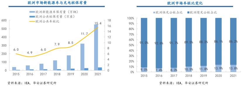 欧洲市场是仅次于中国的全球第二大充电桩市场,2021年欧洲公共充电桩全球市场份额约24.5%。当前,欧洲充电桩的建设进度慢于新能源车,据IEA统计,截至2021年欧洲新能源车保有量为550万辆,公共充电桩保有量为35.6万座,公共车桩比高达15:1。主要的充电桩存量也以慢充为主,占比为86%。