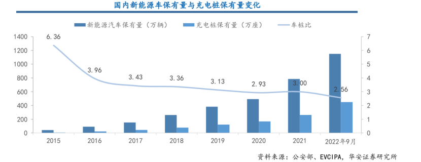 截至2022年9月,我国新能源汽车保有量达1149万辆,充电桩保有量达448.8万座,车桩比下降到至2.56∶1。不过,仍旧无法满足市场充电需求,在政策和市场双重驱动下,充电桩产业链有望迎来加速发展。