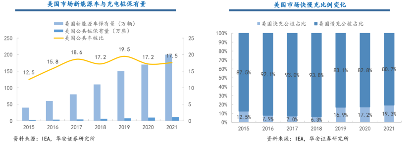 美国公共车桩比例与欧洲市场类似。据IEA统计,截至2021年美国新能源车保有量为200万辆,公共充电桩保有量为11.4万座(充电站3.6万座),公共车桩比达17:1。慢充占比略低于欧洲市场,约为81%。