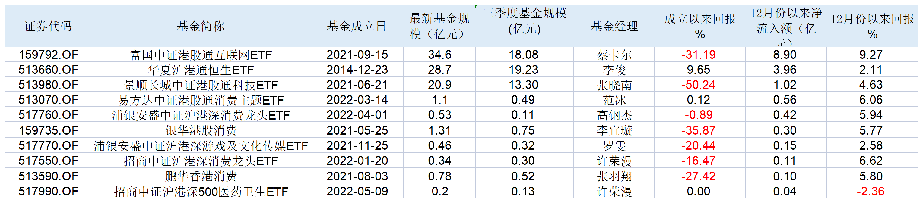 相比三季度末的规模,上述多只ETF的实际规模已经出现了大幅增加。Wind数据显示,截至12月21日收盘,富国中证港股通互联网ETF的最新规模为34.6亿元,相比三季度末的18.08亿元已经增加了16.52亿元;华夏沪港通恒生ETF的最新规模为28.7亿元,相比三季度末增加了9.47亿元;景顺长城中证港股通科技ETF的最新规模是20.9亿元,相比三季度末增加了7.6亿元。