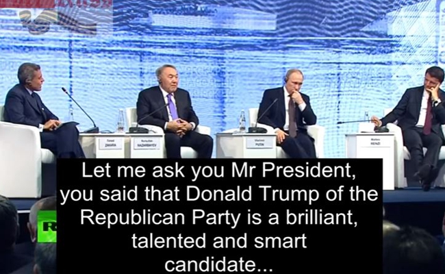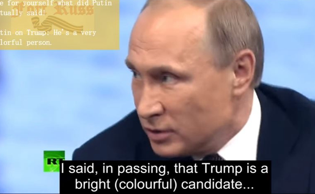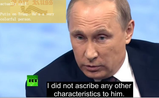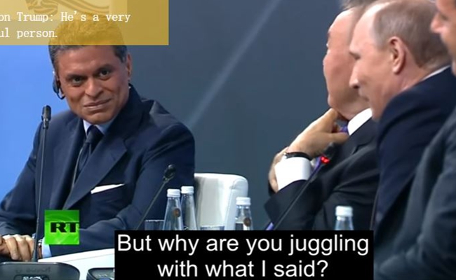 当时有记者问普京对特朗普是什么看法,根据《俄罗斯内幕》新闻网的翻译,普京回答称特朗普是一个“colorful person(引人注目的人), 毋庸置疑是个有才华的人。但判断他具有怎样的价值并不是俄罗斯的事情”。