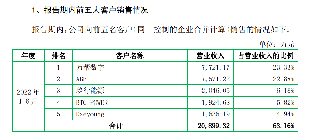 奇高的毛利率,更多还要感谢优优绿能的客户兼股东。近年来优优绿能对前五大客户的销售额占营业收入比例一直维持在60%以上,2022年上半年高达63.16%,客户集中度较高。