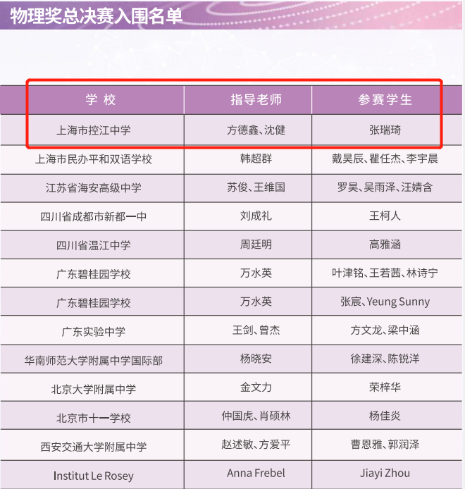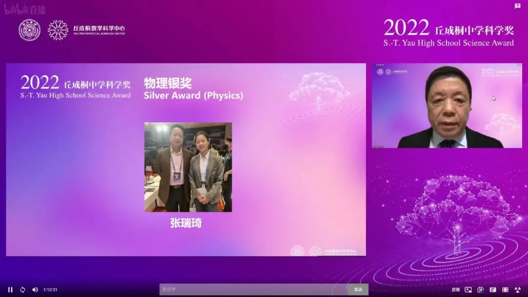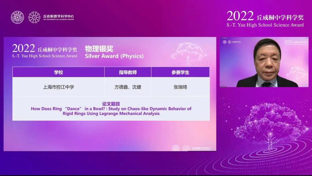 近日2022丘成桐中学科学奖总决赛落幕。经过为期一天半的激烈角逐,控江中学张瑞琦同学以第二名的成绩荣获物理奖银奖!