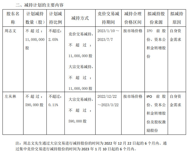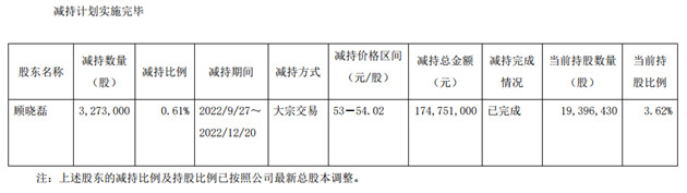 顾晓磊的上述股份减持计划于2022年9月22日披露,即自减持计划公告之日起的3个交易日后的3个月内,通过大宗交易的方式减持不超过327.30万股(不超过公司当时总股本的0.61%)。