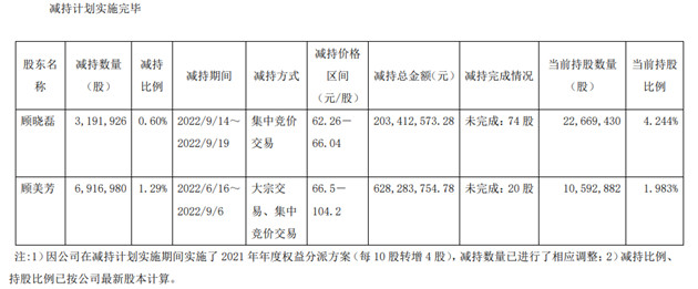 2022年6月至9月间,顾晓磊、顾美芳合计减持1010.89万股,合计套现8.32亿元。