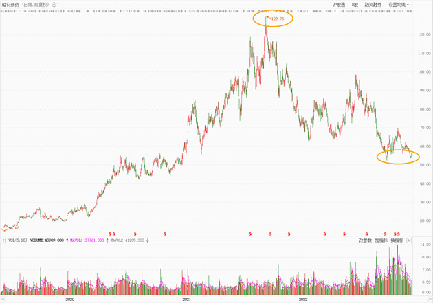 从2021年8月股价最高点到2022年12月22日收盘,昭衍新药股价出现了波动下跌趋势,从129.76元/股(前复权)跌到54.70元/股,每股跌去75.06元,跌幅57.85%。即便股价在下跌过程中,上述几位董事及其一致行动人还是实施了大规模减持套现。