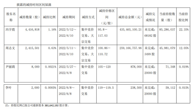 2022年5月至6月间,冯宇霞、周志文合计减持683.23万股,合计套现6.95亿元。