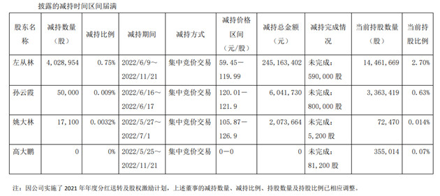 2022年6月至11月间,左从林减持402.90万股,套现2.45亿元。