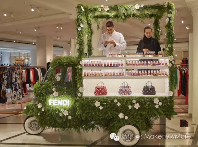 人们可以在这里购买FENDI限量版皮包以及一系列由Makoto设计的花束。 绿色的植物郁郁葱葱,点缀着皮革制成的小花,车上售卖的花瓣水瓶是一大亮点。瓶子上装饰着Fendi标志性毛球,颜色可以自选,由花艺师亲手制作。随着时间推移,花瓣在花瓶里会逐渐变色并自然风干成为永生花。生命的流逝,让一个小花瓶变得意义非凡。