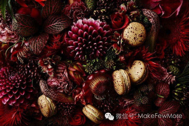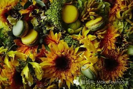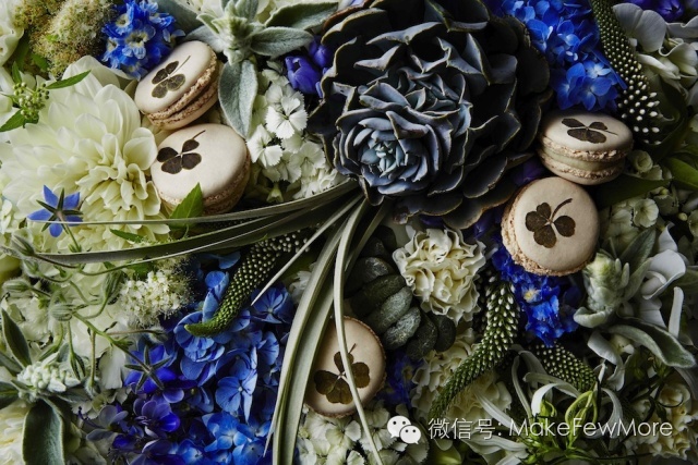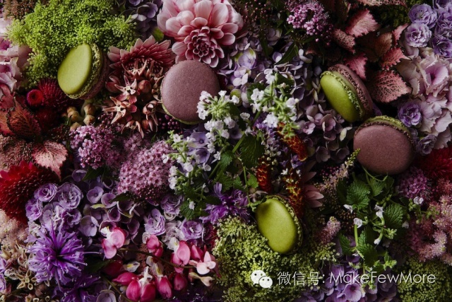 马卡龙:甜品中的贵族,制作精良,外表柔美,是一道著名的法式甜点。PIERRE HERMé 这次与Azuma Makoto的合作珠联璧合。马卡龙色彩缤纷,而Azuma的日本花艺同样绚丽,他将甜品与花瓣的形状和隐喻的话语融合在一起,使得马卡龙不再仅仅是一种甜点,更是一件不朽的艺术品。