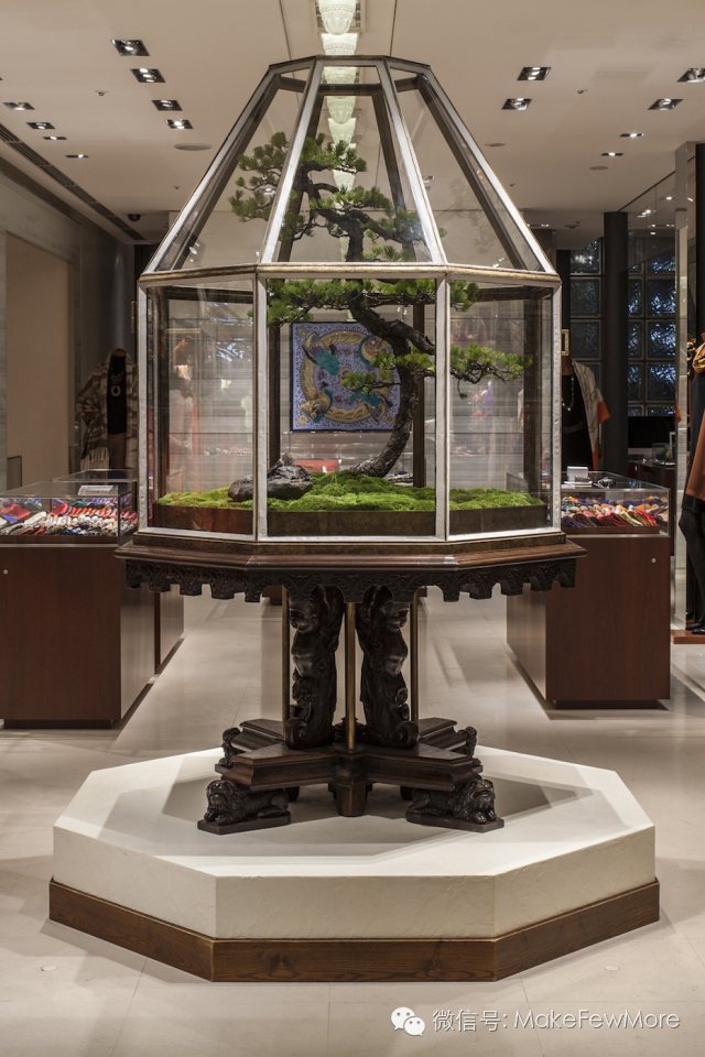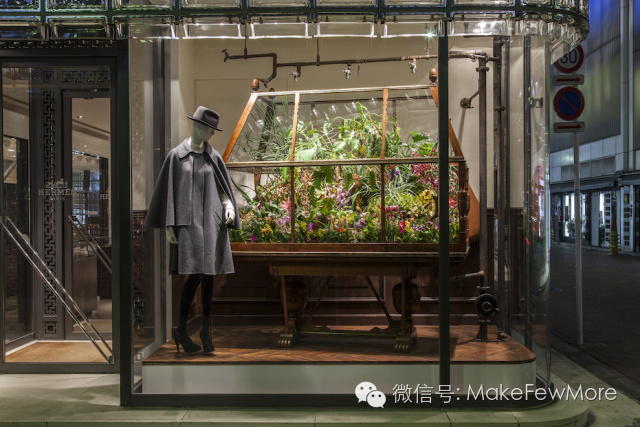 18世纪,第一面用于商品展示的橱窗诞生在伦敦查令十字街后,大街小巷,就开始有了独特的风景。起初的刻板道具、呆瓜木偶,纵使华丽却也死气沉沉。直到有人醍醐灌顶,起用植物搭景——突然间,植物与欲望纠缠,物质浸润生机,连浮华都变得天真起来。而芸芸橱窗设计中,非爱马仕的植物主题设计堪称一绝。2012年,在年度主题“时光之礼”的灵感推动下,他们与Azuma Makoto展开了名为“时之庭”(Garden of Time)的跨界合作。
