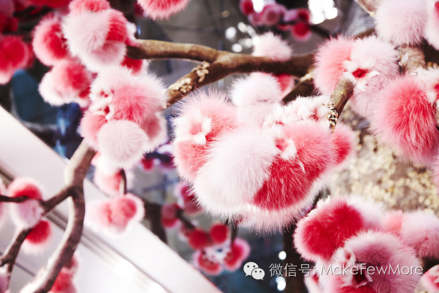 除了设计梦幻的Flower land, Azuma Katoto还为Fendi设计了几株皮草树。这些树是用人造材料做成的仿制自然植物。他选用苔藓和树皮做了树干,用了Fendi标志性的彩色毛球作为点缀。这种超现实的艺术表现手法,将自然的和谐与美带到了枯燥的商店。
