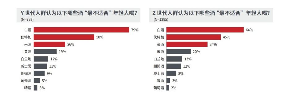 此外,白酒和黄酒在认知中是“上一代喝的酒”,最不适合年轻人喝。定量调研结果显示,认为白酒不适合年轻人喝的占比达70%,其次是伏特加占比47%,认为黄酒不适合年轻人的占比达28%。