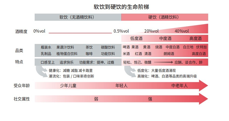 年轻人饮酒存在生命阶梯:随着年龄增长,从软饮过渡到硬饮。同时,软饮和硬饮并非完全割裂,两者的交融衍生出大量品类创新机会。顺应年轻人酒饮生命阶梯,基于酒饮品类心智资源建立清晰年轻人饮用场景,蕴藏大量新品类机会。