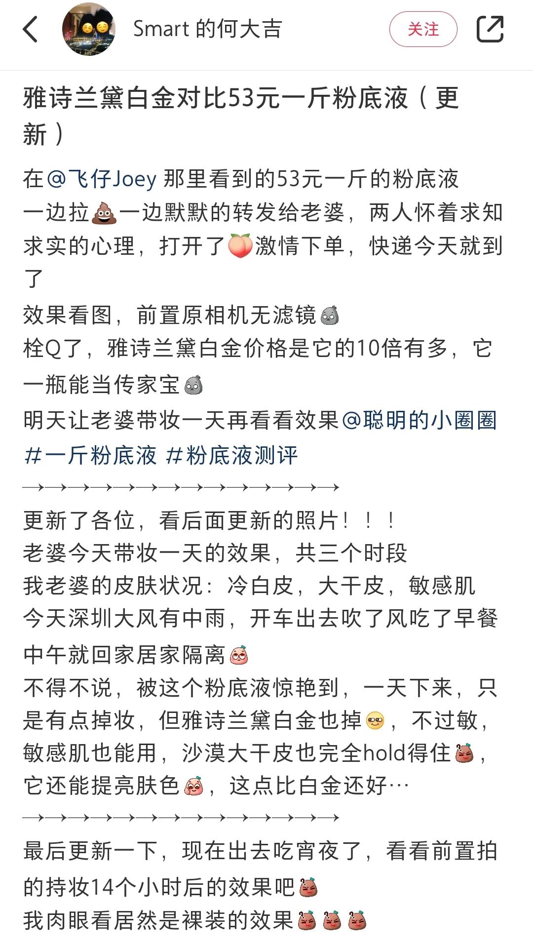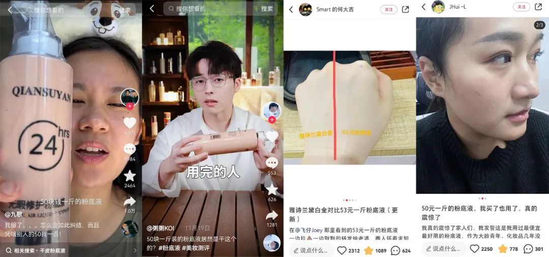 甚至有博主,将50元粉底液中热度最高的芊木源与官方售价920元的雅诗兰黛白金粉底液进行妆效对比,认为芊木源一天妆效与白金粉底液不相上下,还有部分网友认为妆效更好。