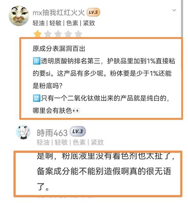 不过,虽然这款粉底液的妆效在小红书得到了诸多消费者和博主的认可,但也受到了美丽修行中部分具有专业知识的消费者“成分表造假”的质疑,质疑原因有两点: