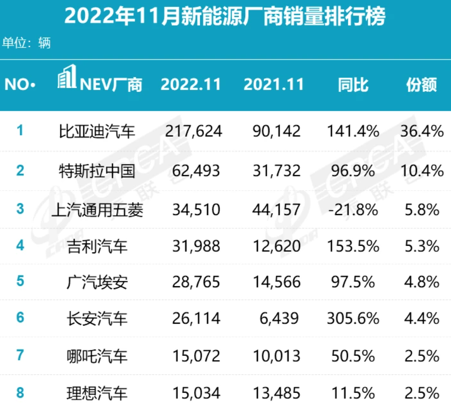 2022年11月新能源车销量排行
