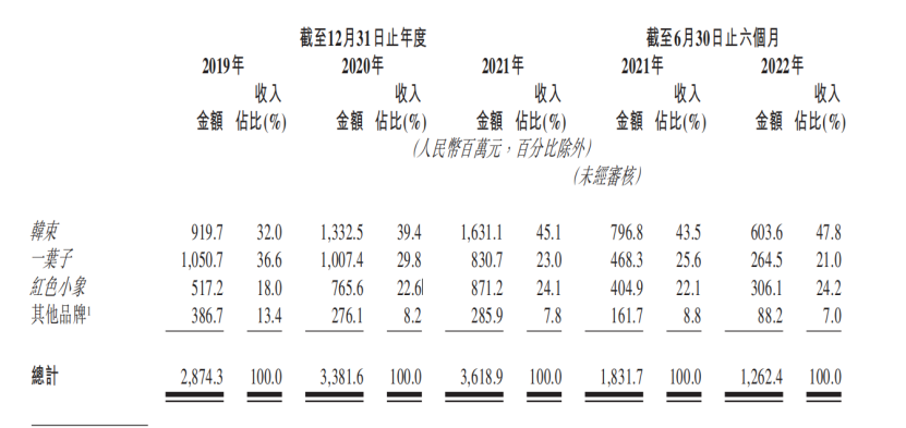 细分来看,根据上美港交所聆讯后资料集,上美的收入主要来自韩束、一叶子和红色小象这三个品牌,它们于2019年、2020年、2021年及截至2022年6月30日止六个月分别贡献了总收入的86.6%、 91.8%、92.2%及93.0%。