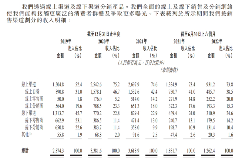 从渠道来看,2019年-2022年上半年,上美集团线上渠道收入分别为15.05亿元、25.43亿元、26.98亿元和9.31亿元,占总收入比分别为52.4%、75.2%、74.6%和73.8%。