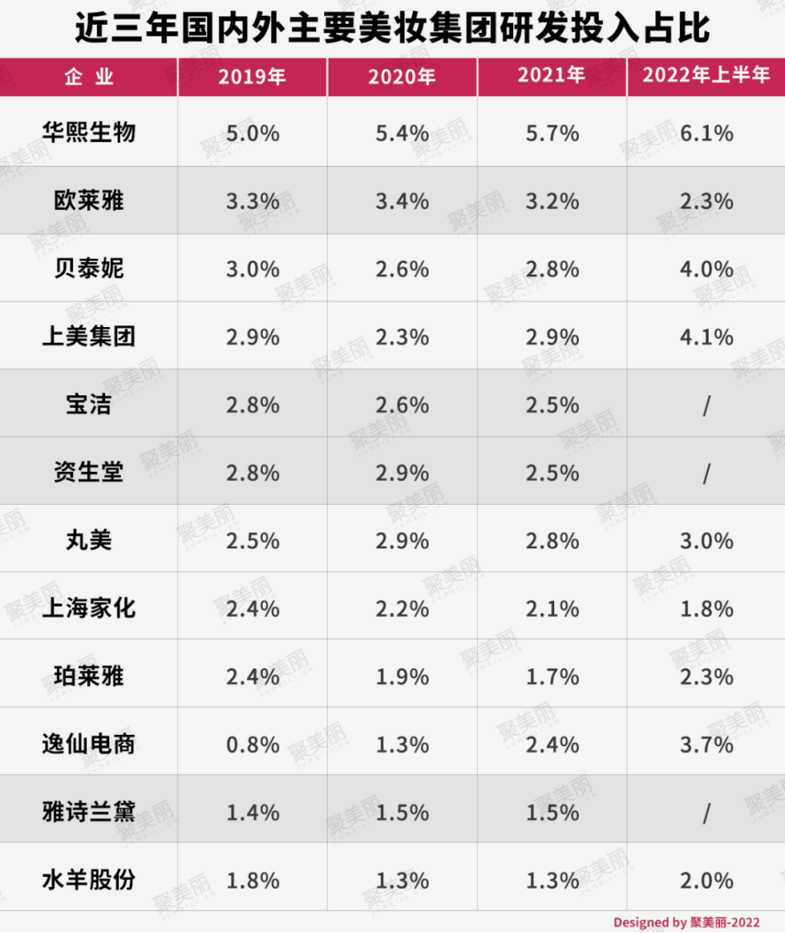 中信建投证券在一份研报中统计,国际品牌研发费用率主要集中在1.5%-3.5%之间。而根据观研天下数据,2018—2020年,本土上市化妆品品牌的研发费用率平均为2%~3%。两者并没有明显差异。由此看来,“个位数占比”是全球常态,国货在研发方面的投入并不算差。