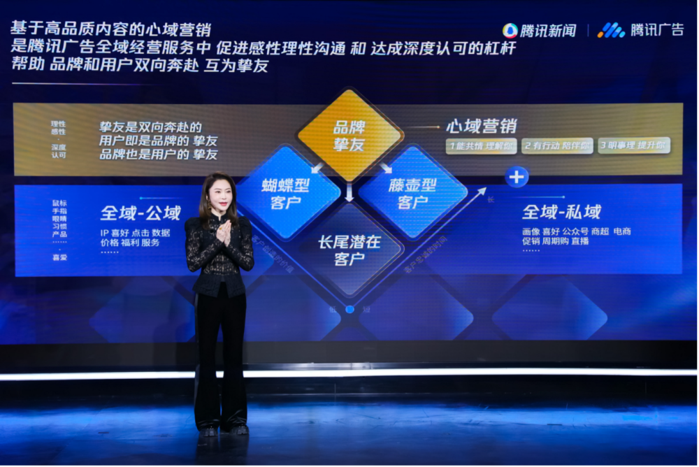 而品牌和用户如何在腾讯新闻实现双向奔赴?腾讯公司副总裁栾娜指出,品牌营销同样需要不断转变,思考如何推动各层级用户真正成长为品牌挚友。而在这一过程中,基于高品质内容的心域营销就成为品牌全域营销中促进感性理性沟通和达成用户深度认可的杠杆,实现品牌与用户之间的双向奔赴,形成挚友。