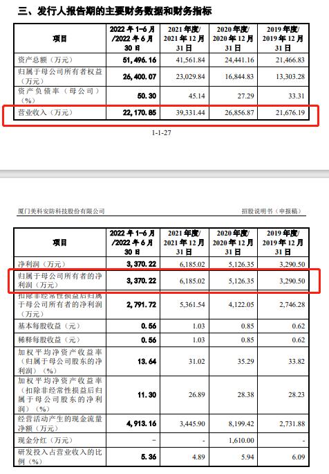 2019-2021年及2022年上半年,美科科技的营业收入分别为2.17亿元、2.69亿元、3.93亿元、2.22亿元,归母净利润分别为3290.50万元、5126.35万元、6185.02万元、3370.22万元。