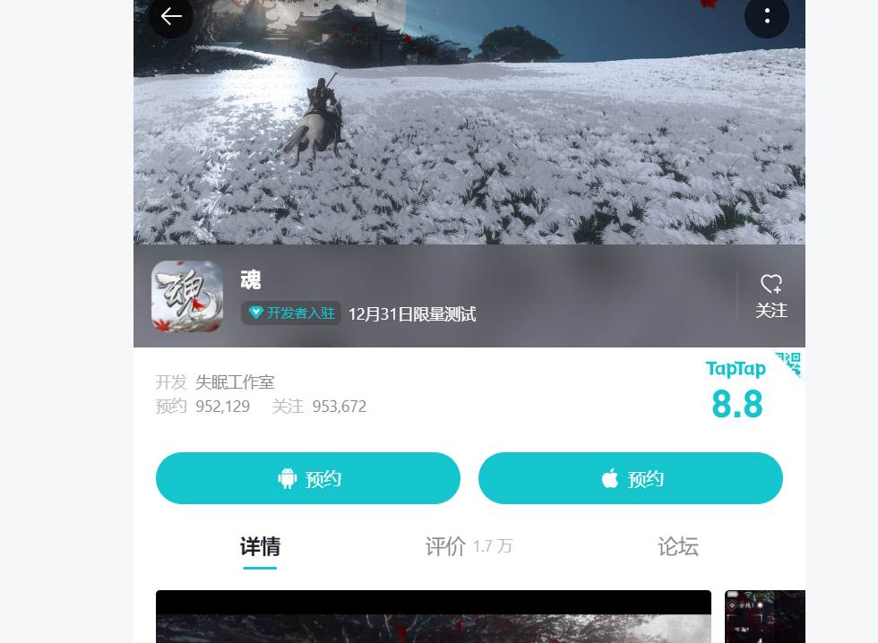 于今年上半年在TapTap上开放预约,依靠一段极具美感的跑马视频和截图以及游戏的种种“良心”描述,吸引了大量玩家关注与预约,截止发稿前,《魂》在TapTap上的预约人数已经近百万。但与之相对的,是这款游戏背后的扑朔迷离。
