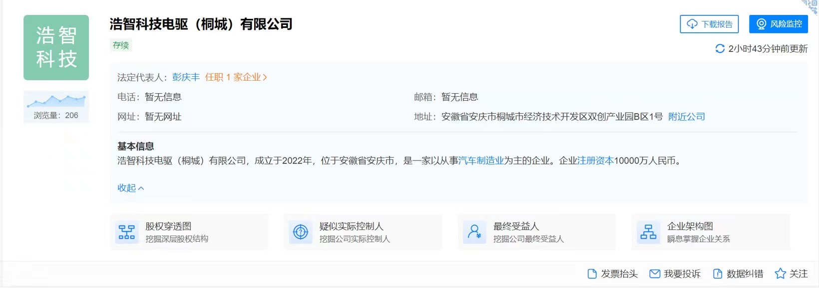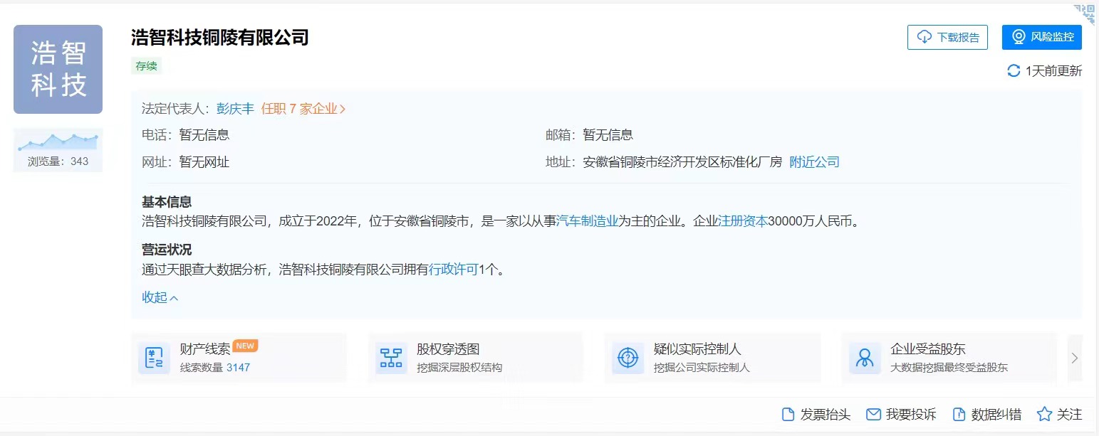 据天眼查显示,最新注册的公司全称为浩智科技电驱(桐城)有限公司,注册资本1亿元人民币,注册地为安徽省安庆市桐城市经济技术开发区。