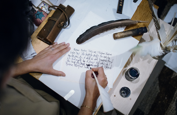 进门后等着你的是Thomas’s Café,它和Burberry里根街旗舰店里的咖啡馆一脉相承。当参观者习惯室内光线后,向右就会看见手工艺者,他们一边做流苏、编织马毛、拼接刺绣、装订图书,一边向访客轻声讲解。最深处的一面墙上贴满本季设计参考,有些是手绘稿,有些是历史文献,还用钉子固定着各种面料,其中包括在上一季大出风头的包袋Patchwork。不过,最突兀的或许是长篇小说《奥兰多》——本季时装灵感便来源于此。它的作者是英国意识流代表弗吉尼亚·伍尔芙,小说中记录了主人公奥兰多从16世纪贵族少年转变为20世纪女性之身,跨越300多年的故事。