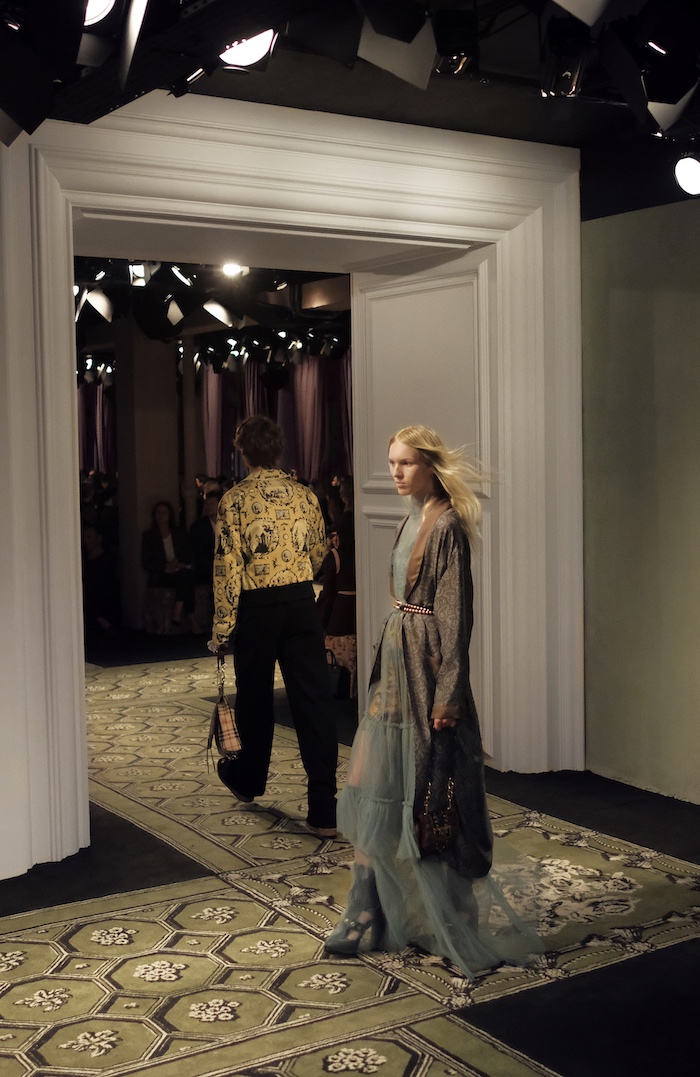 “我不断寻找性别上自然流畅的转换。”Christopher Bailey说起灵感来源,“而且《奥兰多》里的诗句非常美。”从第五套造型开始,男女模特穿插登场。
