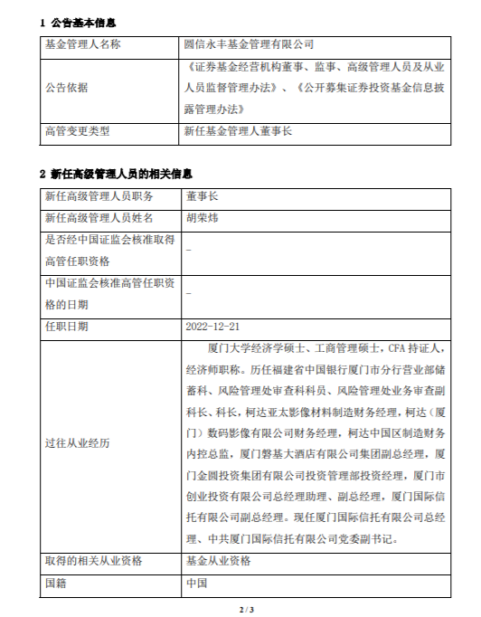 公告显示, 胡荣炜为厦门大学经济学硕士、工商管理硕士,CFA持证人,经济师职称。现任厦门国际信托有限公司总经理、中共厦门国际信托有限公司党委副书记。界面新闻记者从圆信永丰基金公司了解到,此次胡荣炜为兼任公司董事长。