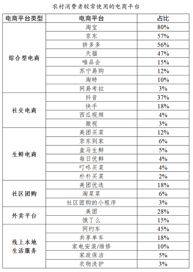同时,调查发现可供农村消费者选择的电商平台类型众多,其中淘宝(80%)、京东(57%)等传统电商平台仍是主要渠道,抖音(37%)、快手(18%)等社交电商在快速崛起,生鲜电商、社区团购、外卖平台等电商渠道也在逐步普及。