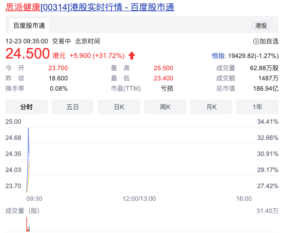 12月23日,思派健康在港交所挂牌上市,发行价每股18.60港元,上市大涨27.42%至23.7港元,市值180.84亿;截至发稿前,每股涨至24.5港元,市值186.94亿。