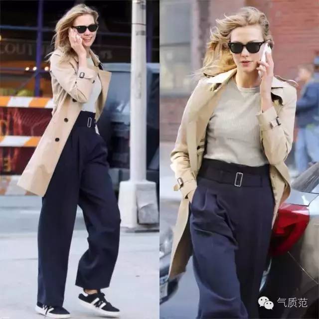 KK这身搭配比较有新意,上身同色系中规中矩,下半身选择高腰阔腿裤搭配球鞋,混搭的很时髦。