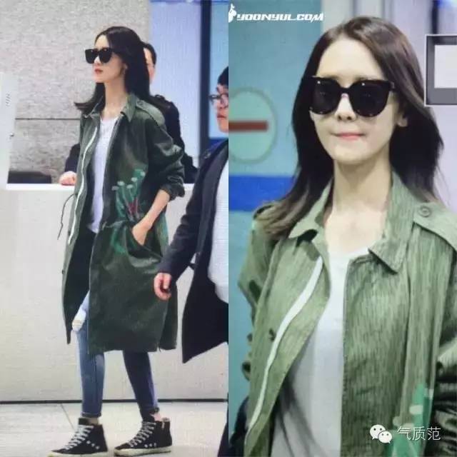 允儿,允儿这身休闲范儿,风衣是军绿色加上一些团区别于经典款,蛮有新意的,破洞裤搭配现在很红的小脏鞋。