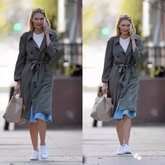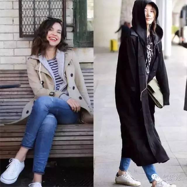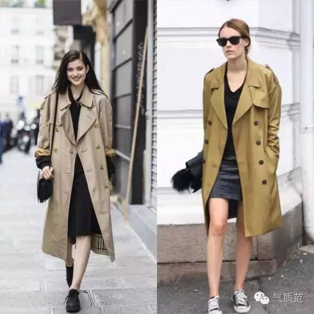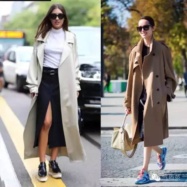 开叉裙+厚底鞋,显腿长的好搭配,右边这种oversize风衣搭配运动鞋也很时髦,不过比较适合高个子,不然会显矮。