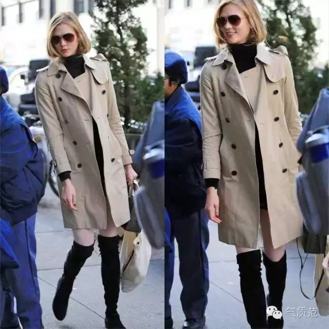 风衣里一个op,下面踩一双过膝靴,很方便经典的搭配。对了选择这种搭配请尽量穿过膝靴噢,显高不是一点点。